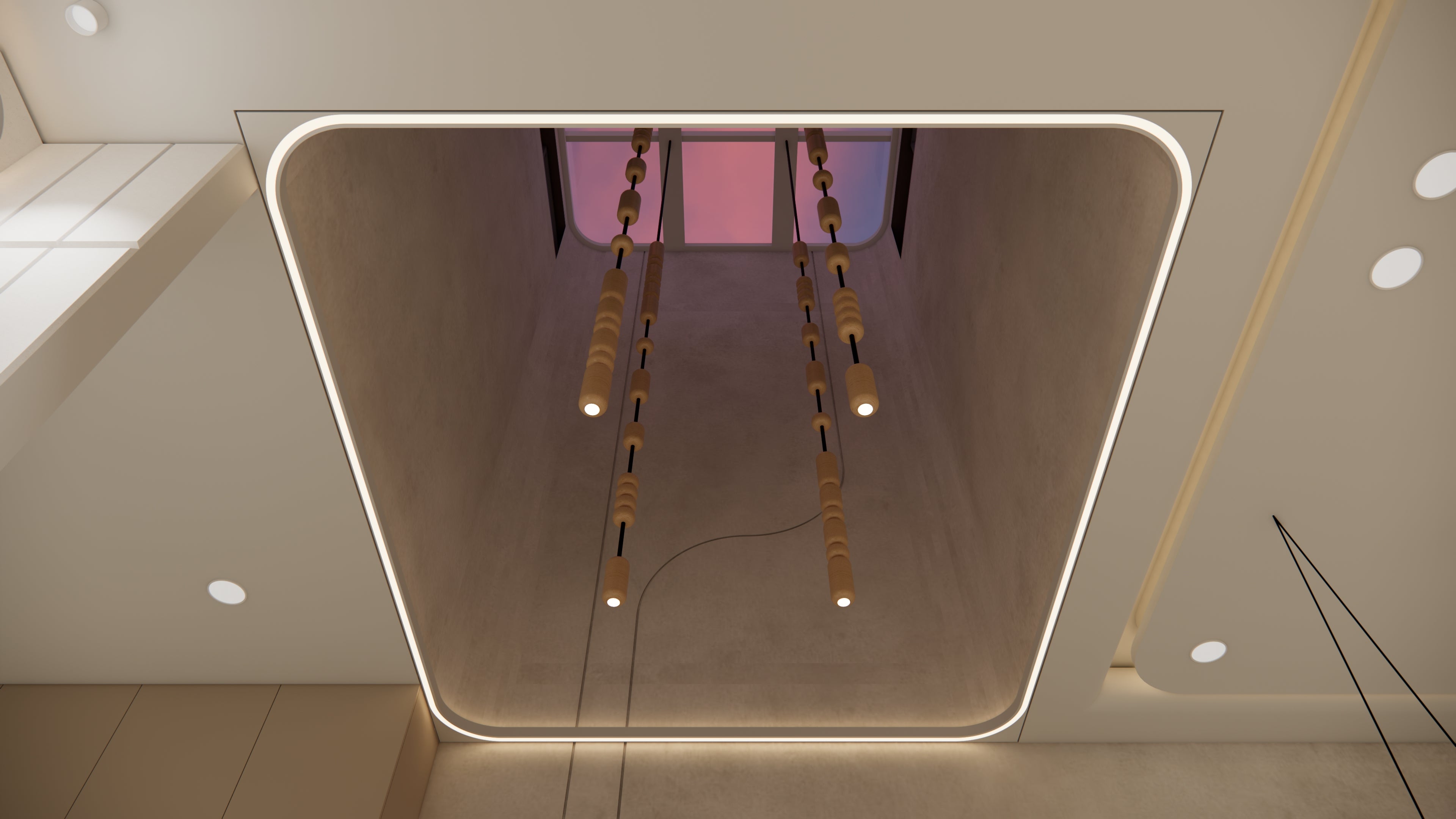 Varshan is a dramatic double-height installation designed to evoke the beauty of rain within architecture. Suspended from a glass and metal frame at the ceiling, wooden pieces of varying lengths cascade downward, creating the poetic impression of rainfall frozen in time. The interplay of light and wood brings warmth and rhythm to the space, making Varshan not just an installation, but an immersive experience.
